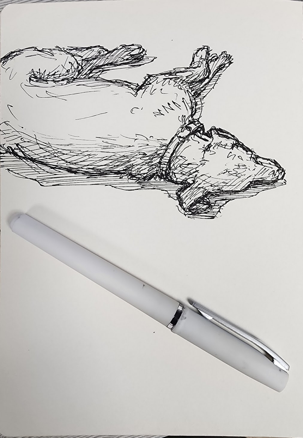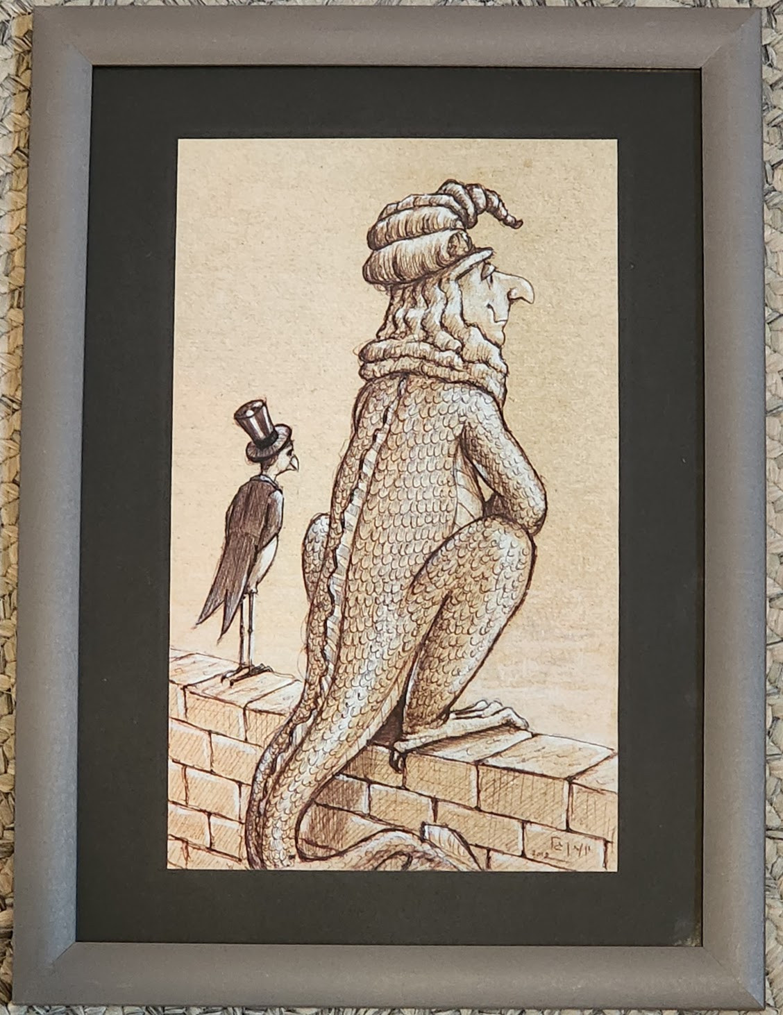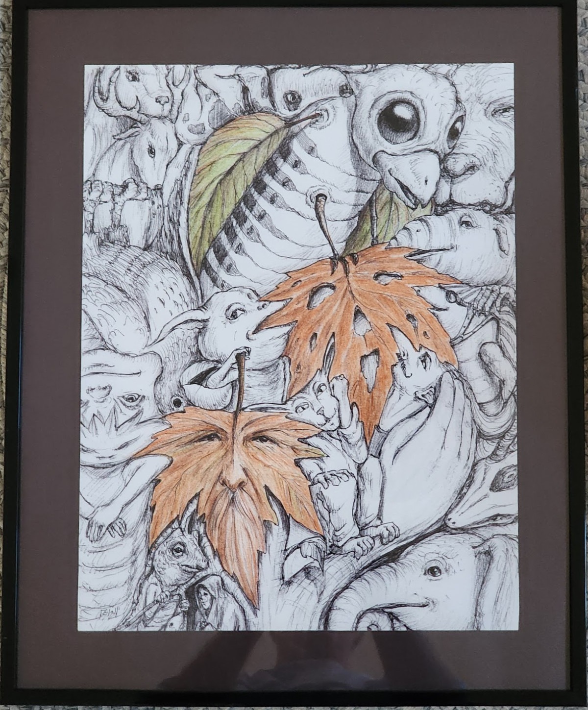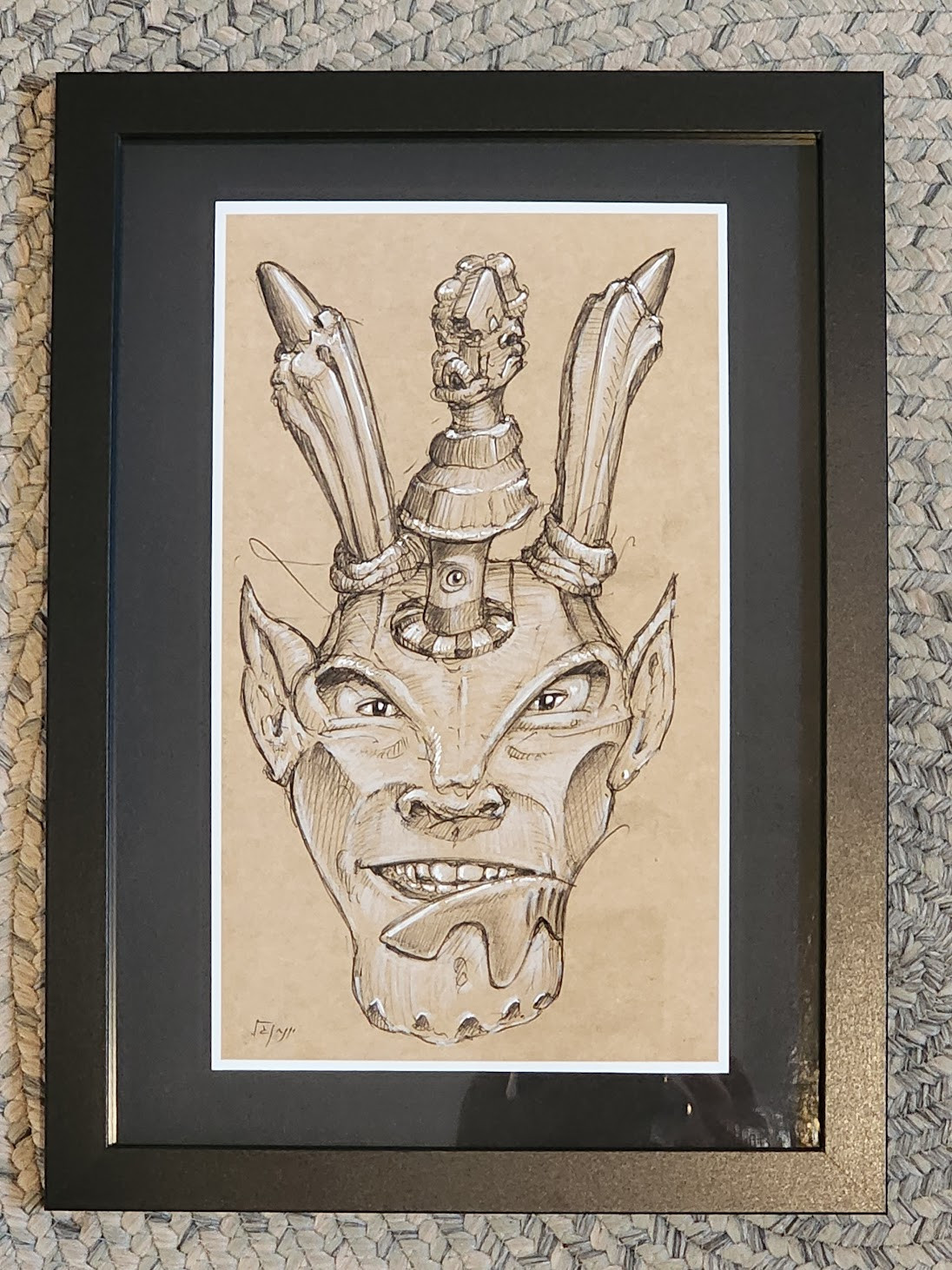 עט ועפרון לבו על קרטון פיצה ,ממוסגר