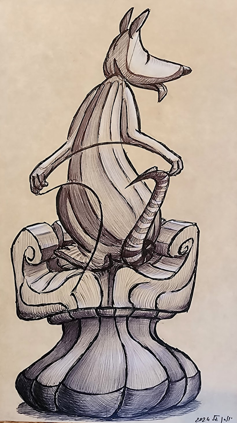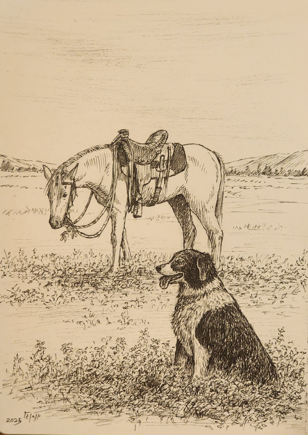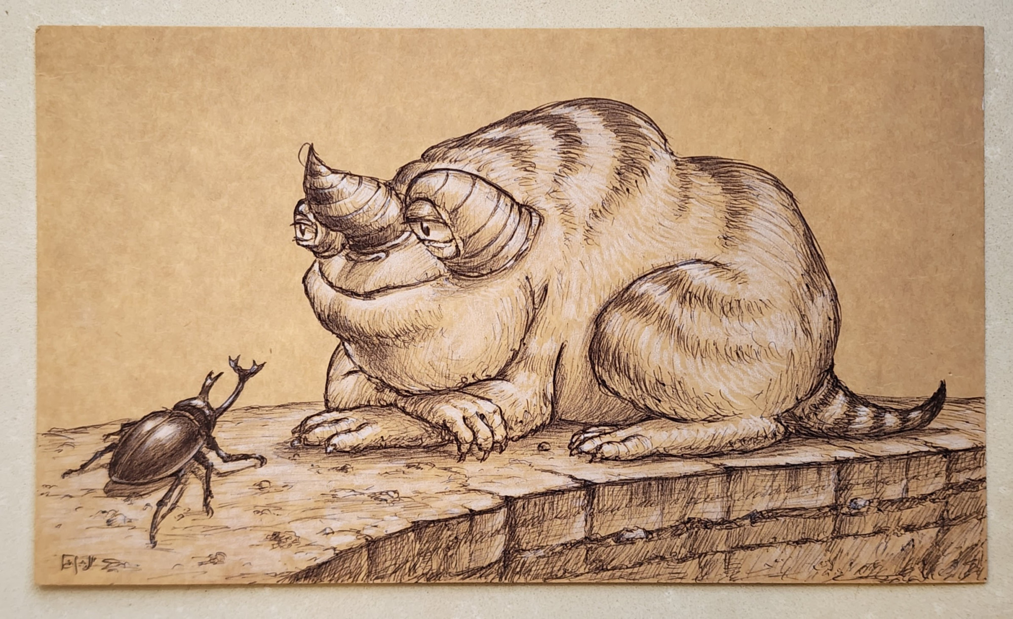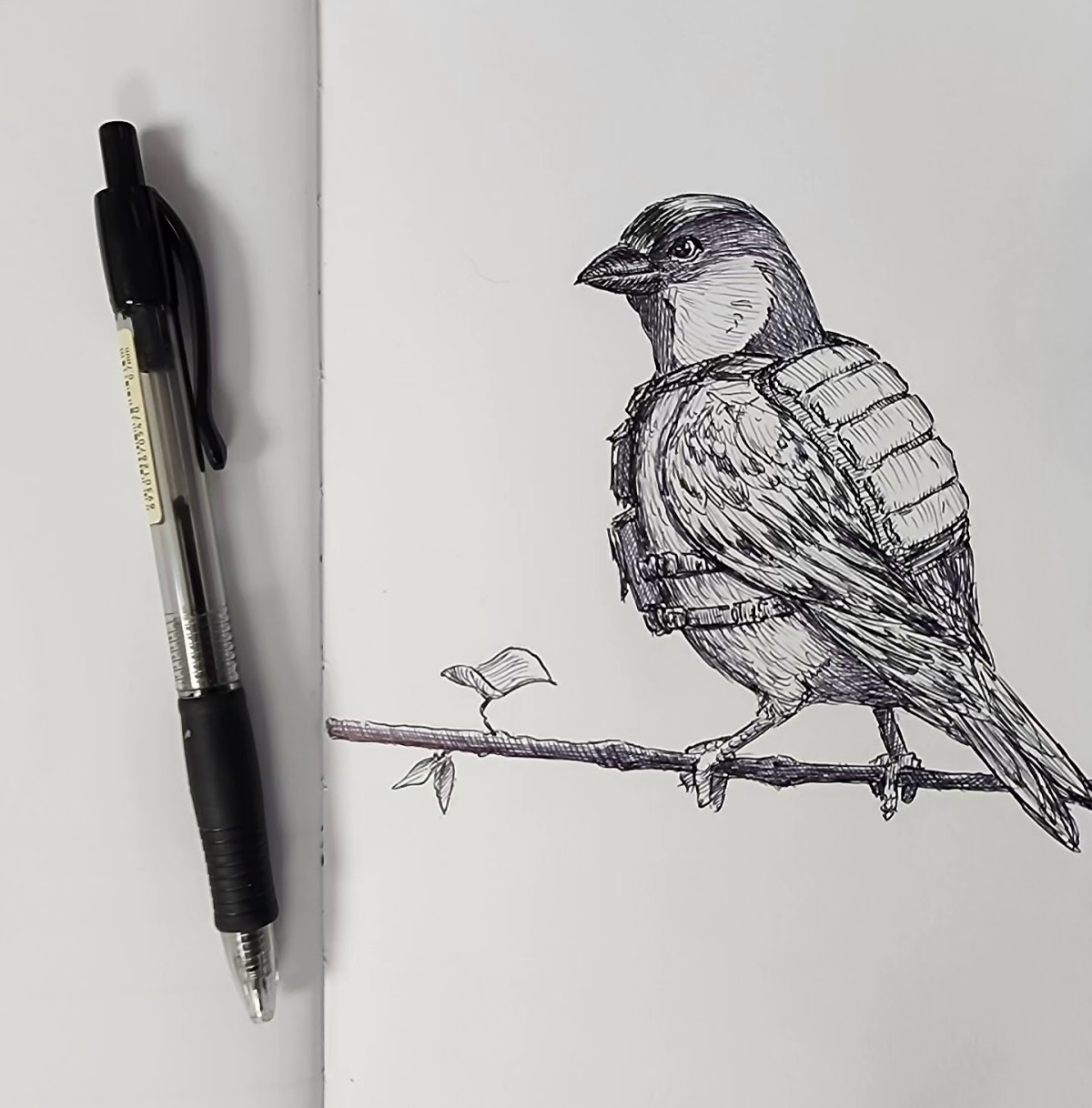 עט ועפרון לבו על קרטון פיצה ,ממוסגר